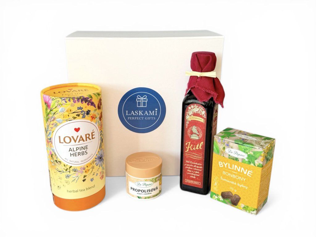Pro sladké potěšení jsou v balení Bonbóny Šumavské byliny 70 g, vyrobené z poctivých bylinných extraktů. O jemnou péči se postará Dr. Popov Propolisová mast s medem 50 ml, která zvláčňuje, regeneruje a chrání pokožku.