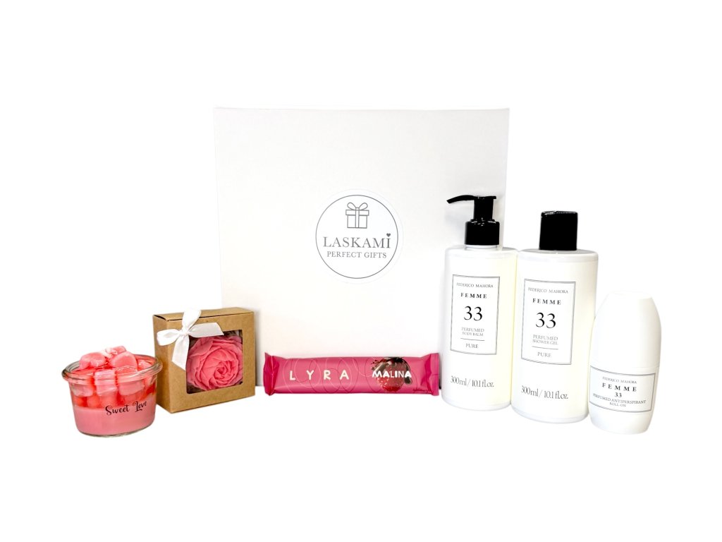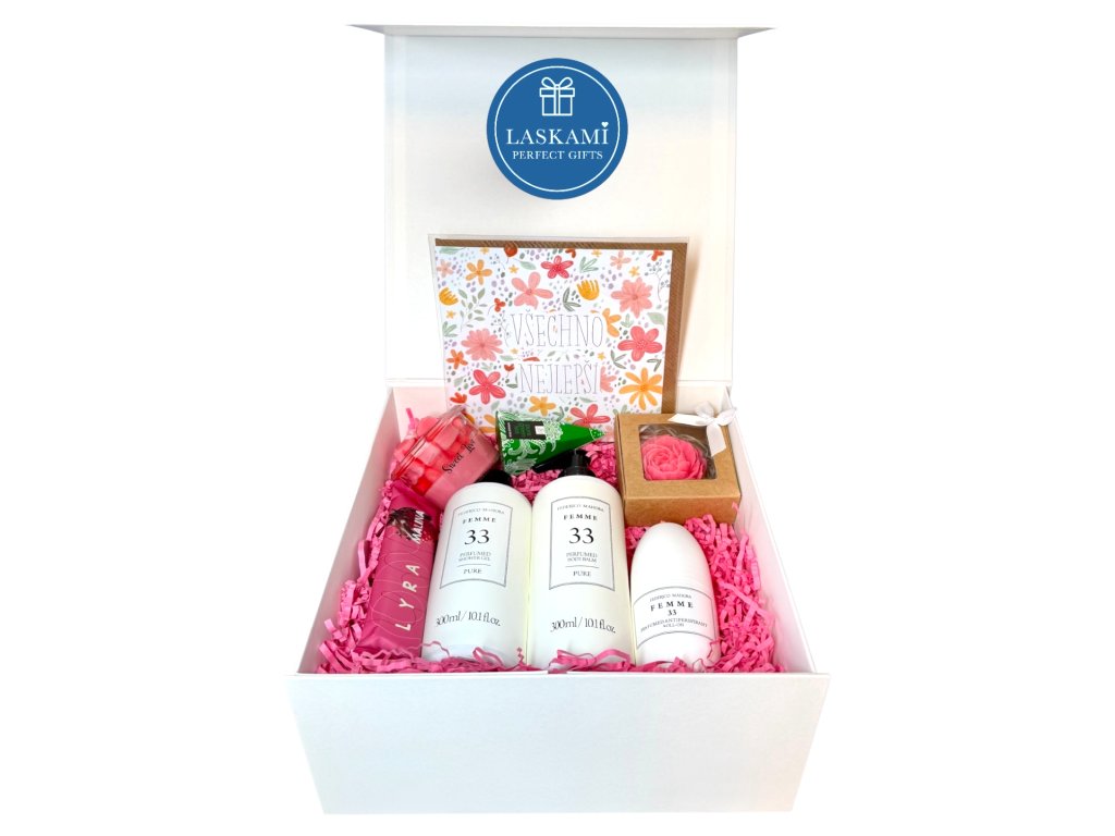 Stylová bílá krabička ukrývá výběr kosmetických produktů pro každodenní péči, doplněný o drobnosti, které zahřejí u srdce. Jemné růžové tóny, elegantní design a vkusná kompozice z něj dělají ideální dárek pro ženu každého věku.