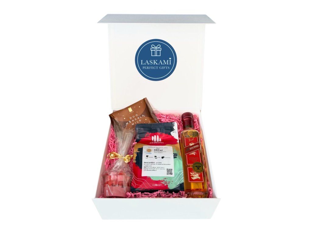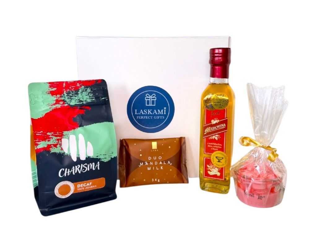 Hledáte originální dárek, který potěší svou chutí, vůní i krásným provedením? Toto dárkové balení kombinuje kvalitní bezkofeinovou kávu Charisma 100% arabiku, jemnou mléčnou čokoládu Lyra Duo Mandala , ručně vyráběnou svíčku s vůní maliny Sweet Love a lahodnou medovinu Kitl – vše v elegantní dárkové krabici připravené rovnou k předání.