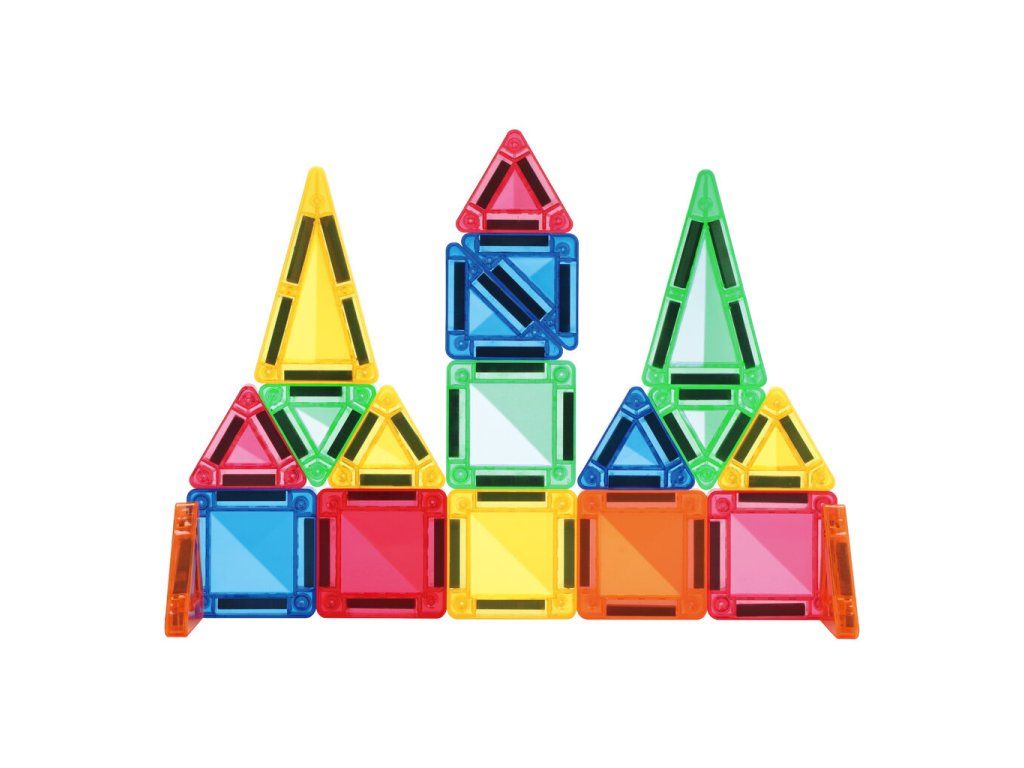 Sada obsahuje 20 barevných průhledných dílků menší velikosti – čtverce a různé trojúhelníky. Díky zabudovaným magnetům se jednotlivé dílky snadno spojují a drží pohromadě, takže si děti mohou kdykoliv postavit svůj vlastní malý svět.