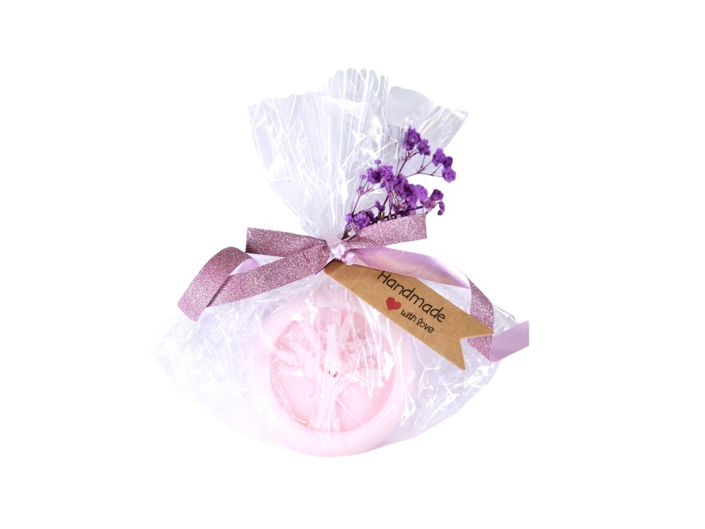 Vonná svíčka je zabalena do elegantní celofánové folii s růžovou mašlí, zdobené sušenou gypsophilou . Průměr svičky 6,5 cm.