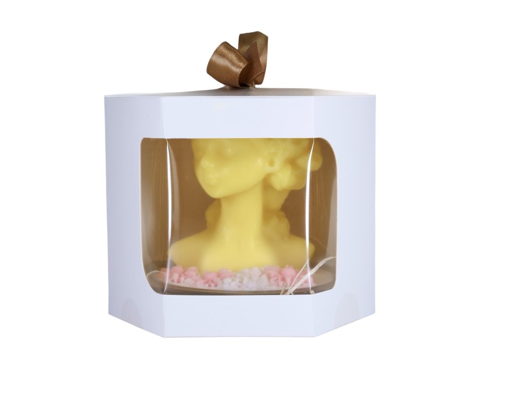 Svíčka zabalena do elegantní bíli krabičky (výška 10 cm, průměr 12,5 cm) se světle hnědou mašli.