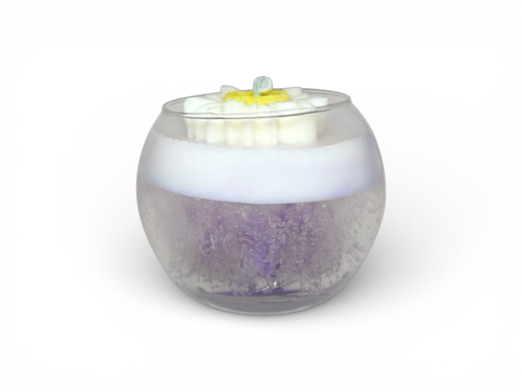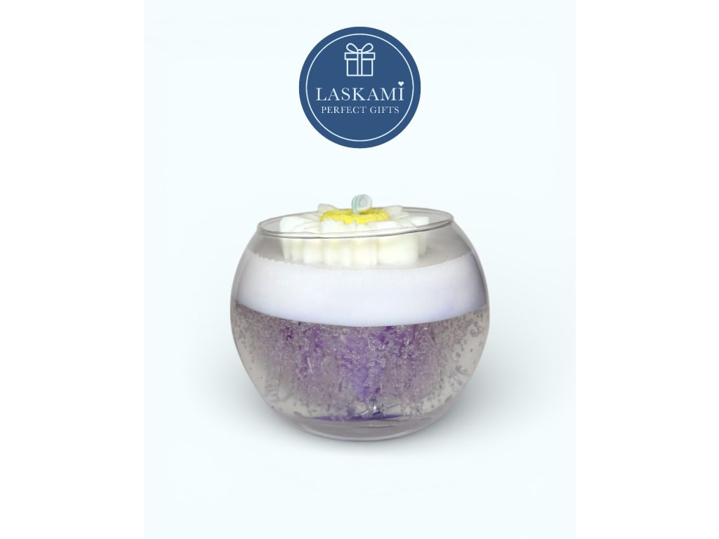 Vonná svíčka je uložena ve stylové, průhledné 250 ml sklenici a zabalena do elegantní celofánové folii s fialovou mašlí. Výška skleničky 8 cm a max. průměr 9 cm.