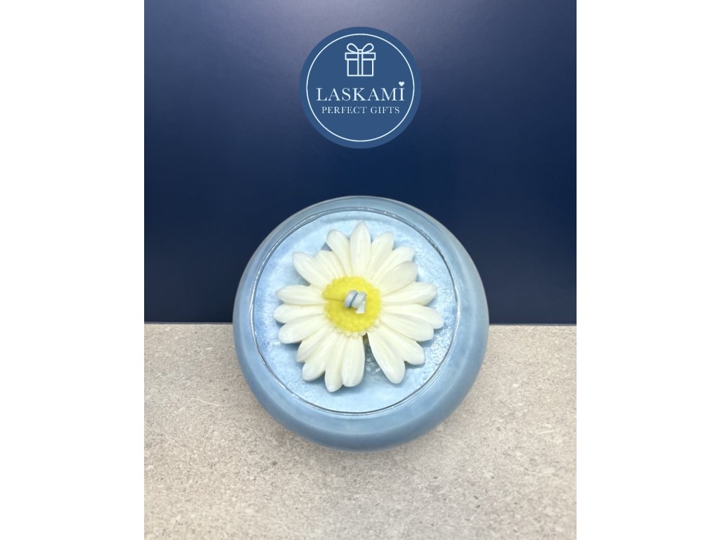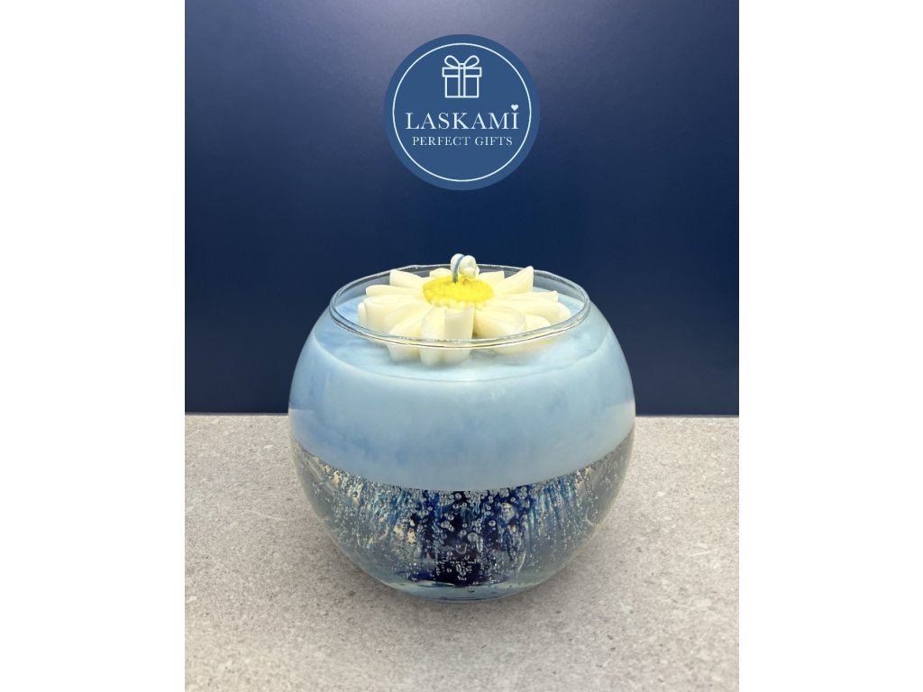 Vonná svíčka je uložena ve stylové, průhledné 250 ml sklenici a zabalena do elegantní celofánové folii s modrou mašlí. Výška skleničky 8 cm a max. průměr 9 cm.